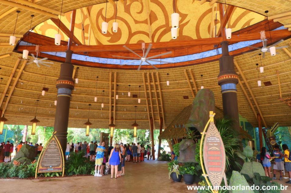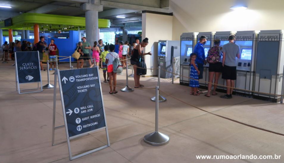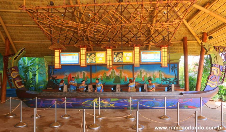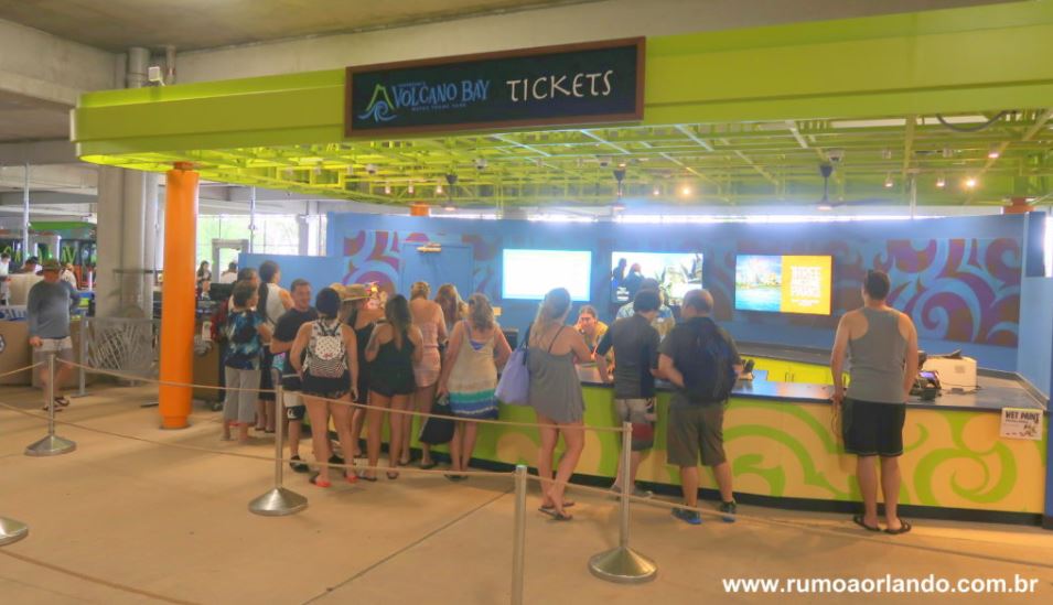 Caso queira adquirir o Dining Meal do Volcano Bay, este é o momento. Dirija-se para as bilheterias, que ficam do lado direito.