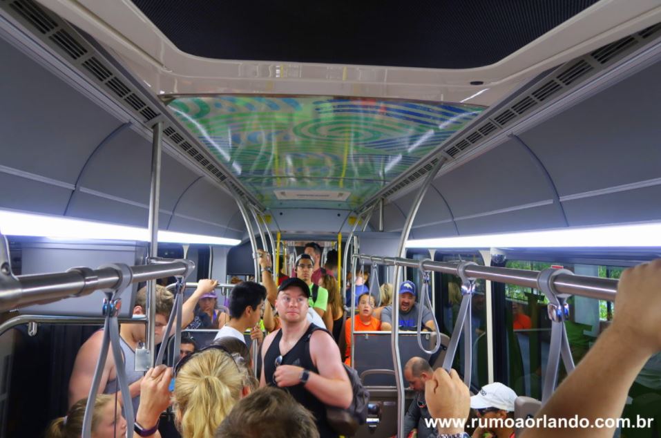 O ônibus é gratuito, com ar-condicionado e televisões dando instruções sobre o parque. Tudo lindo, mas... Não pense que ele será todinho seu, especialmente na parte da manhã, entre 09h e 10h. Não será. É busão lotado mesmo! :)