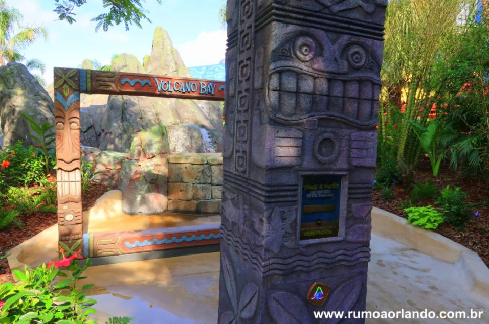 Há apenas dois totens de fotos no parque todo, um logo após as catracas e outro na frente da prainha onde fica o vulcão.