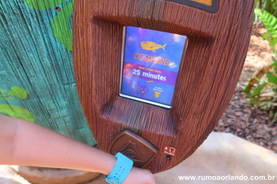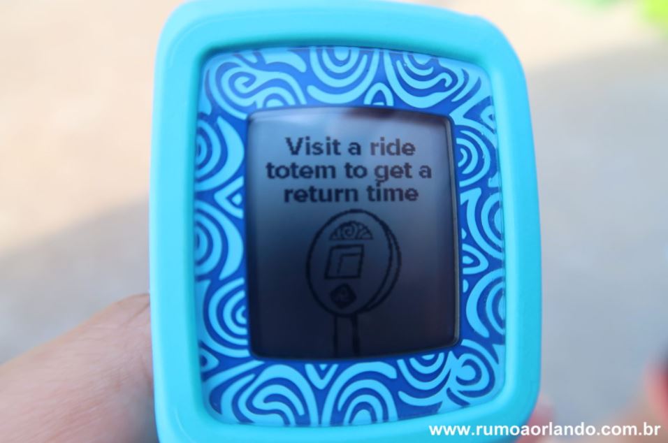 Assim que recebemos a pulseira, já notamos que ela está com um aviso: visite um totem em frente a uma atração para retirar um horário.