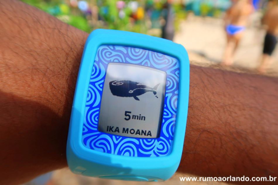 Ficará registrado na pulseira o nome da atração e o tempo em que você deve voltar nela para brincar sem fila. Quando der este tempo, a pulseira vai vibrar e você deve sair de onde estiver e se dirigir para a atração agendada. Quando chegar, basta encostar a pulseira no totem onde estiver um funcionário controlando a entrada no toboágua.