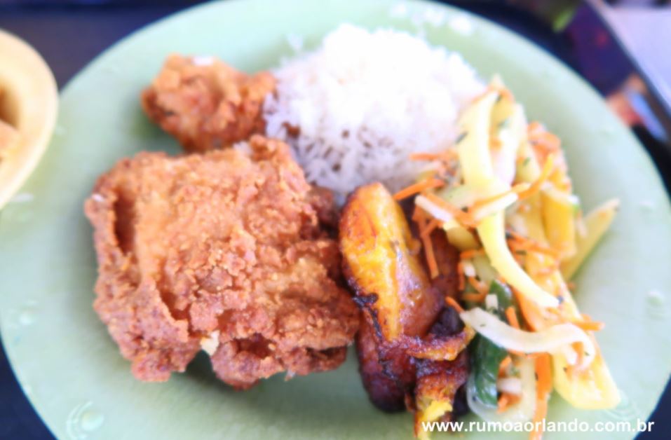 Coconut Crusted Fried Chicken - U$ 11,99 - Peito de frango grelhado, com arroz, banana frita e salada de repolho e manga. Pedimos um side de batatas-fritas para complementar e custou U$ 3,99.