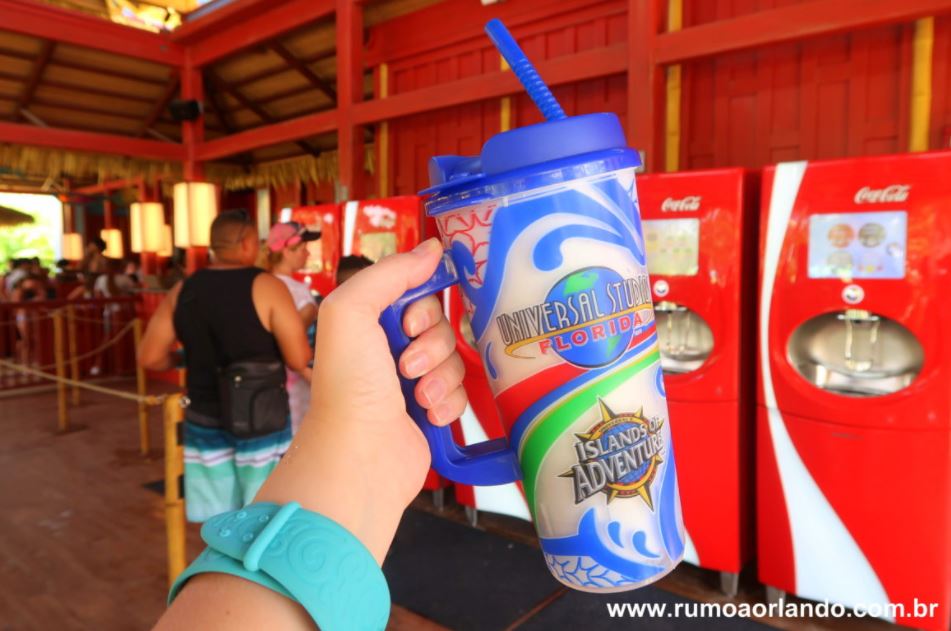 Todos os restaurantes mencionados acima possuem estações com máquinas para encher sua garrafa de refil. Se você já tem a garrafa Coca-Cola Freestyle, que pode ser a comprada nos parques Universal Studios, Islands of Adventure ou no próprio Volcano Bay, você pagará apenas a reativação dela, que custa U$ 7,99.