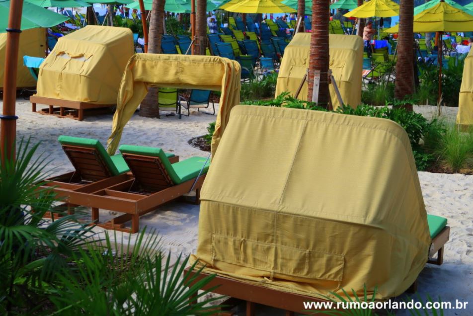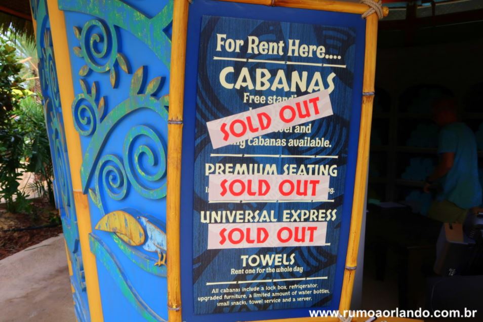 - Assentos Premium: tratam-se de tendas diferenciadas na prainha principal do parque (a do vulcão). Custam U$ 29,99 e possuem um locker dentro, que é uma caixa pequena. A este valor devem ser acrescentadas taxas e, na nossa opinião, é um valor alto para o pouco que oferece. Caso você tenha interesse, reserve antes pelo telefone: +1 (877) 489-8068. Valores sujeitos à alteração.