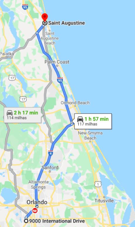 O melhor caminho a seguir é pegar a I-4 sentido norte e depois seguir pela I-95. Ambas as estradas são retas o tempo inteiro e não possuem pedágios. Insira o seguinte endereço no GPS/Waze/Google Maps: 1 S Castillo Dr, St. Augustine, FL 32084.