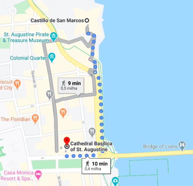 É possível ir andando pelo calçadão, que vai beirando o Matanzas River. São 10 minutinhos de caminhada com um visual de arrepiar! Endereço da basílica: 38 Cathedral Place, St. Augustine, FL, 32084.