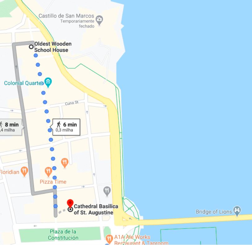 Após a visita à basílica, a dica é seguir a pé em direção à escola de madeira mais antiga dos EUA, a Oldest Wooden School House, que fica na St George Street, uma rua onde se concentram lojas e restaurantes. Endereço da escola: 14 St George St, St. Augustine, FL 32084
