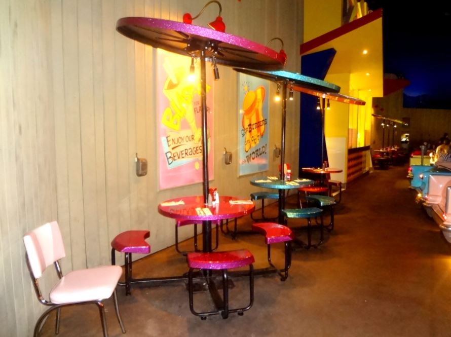 Ele fica localizado bem próximo ao simulador Star Tours, uma das atrações dedicadas aos filmes da saga Star Wars (caso goste deste tema, pode conferir mais informações aqui e aqui). Do lado de fora do restaurante, há um protótipo dos carros que são usados como mesa no local.