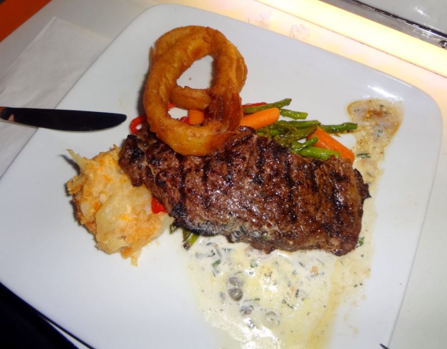 - Flame-broiled New York Strip Steak: bife de carne com molho de ervas, alho e manteiga, servido com purê de batatas, vegetais e cebolas empanadas. Aprovado! Valor: U$33