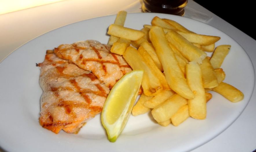 - Grilled Marinated Salmon: salmão grelhado com batatas-fritas. Uma coisa que chamou atenção neste prato foram as batatas-fritas, que são bem diferentes das americanas. As batatas americanas são servidas com cascas, mas no Sci-Fi não. Elas são iguais às brasileiras. "Batata de boteco": gordinhas e suculentas. Hummmmm! O salmão também estava delicioso. Valor: U$15.99