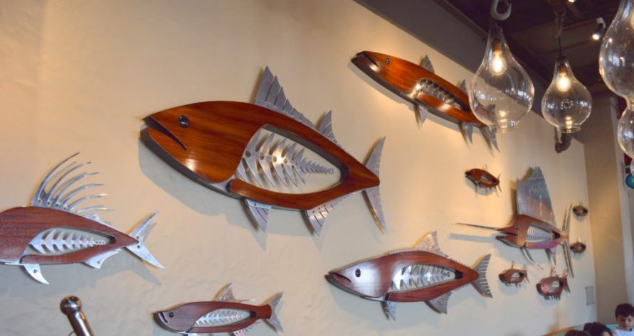 A decoração do restaurante é muito bacana. Gira em torno de tudo ligado à vida náutica: barcos, peixes, pesca e muito mais.