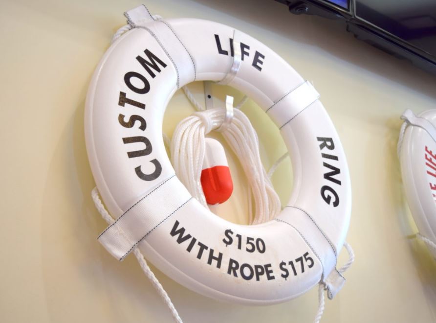 São remos e boias de navio com gravações de textos conforme a sua escolha. A grande maioria coloca o nome da família e fica uma peça bem autêntica para a casa.