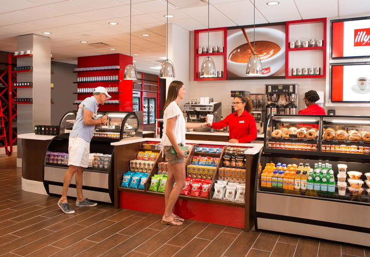Nem é preciso sair do hotel para fazer as refeições, já que há opções de restaurantes que oferecem café da manhã, almoço e jantar, além de um mini-mercado.