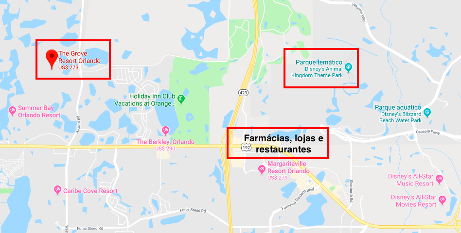 Nos arredores do The Grove Resort há postos de gasolina, Publix, Dunkin' Donuts, lanchonete Denny's e Walgreens.