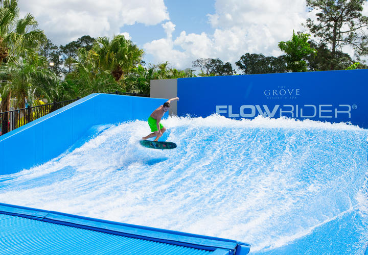No The Grove é possível aproveitar muito bem este dia de descanso, pois o resort oferece uma ampla área de lazer, com piscinas, parque aquático com toboáguas e rio lento, além de um simulador de surfe.