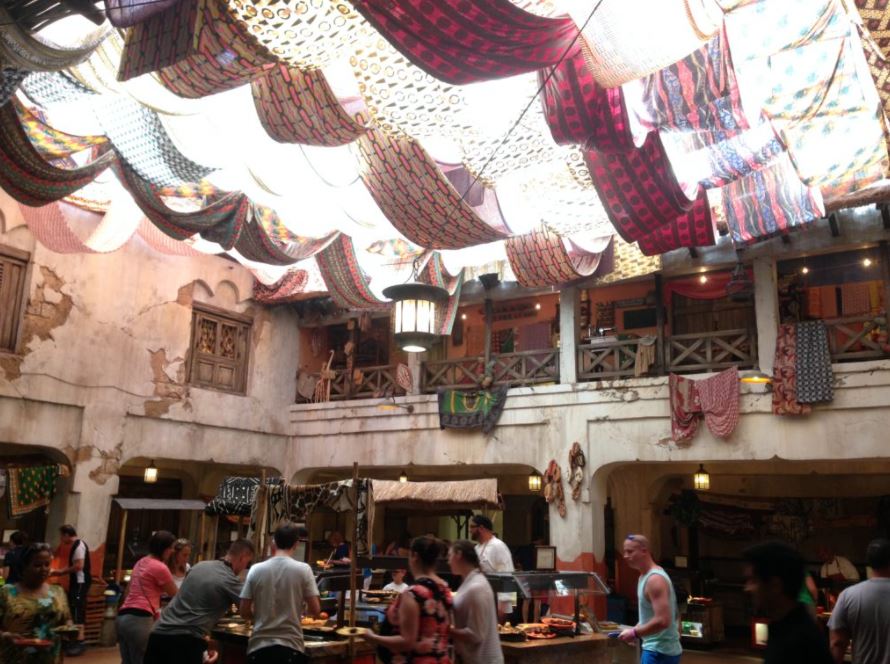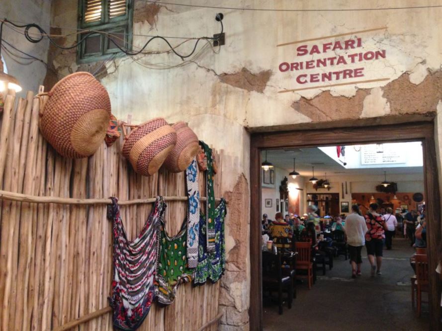 A decoração pode parecer um pouco estranha para quem não está acostumado com toda a temática produzida pela Disney em restaurantes deste tipo. Prédios parecendo ruínas, paredes mal pintadas, com fendas e lenços espalhados pelo teto. Tudo faz parte da temática da África, área onde o restaurante está localizado dentro do parque.